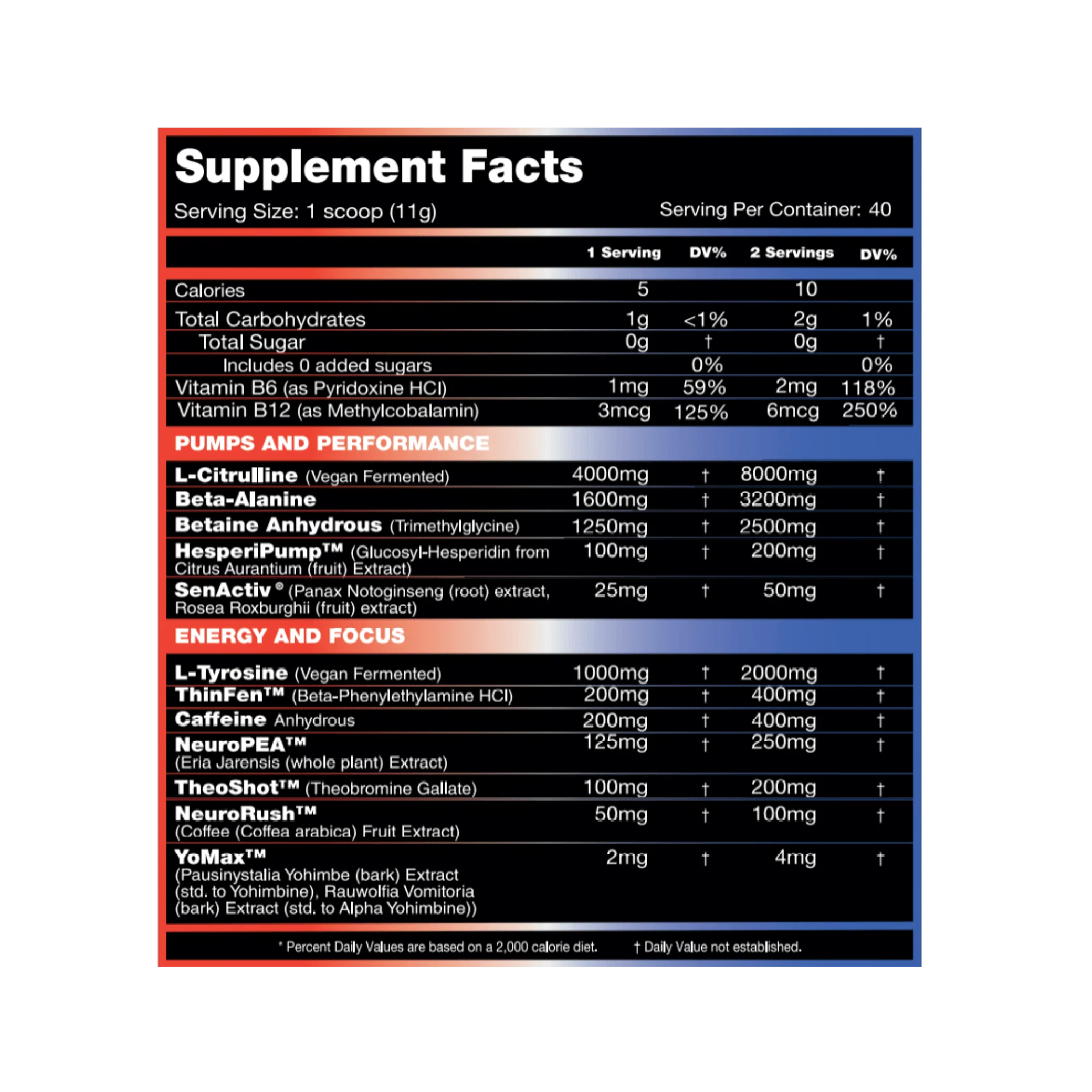 We’ve also included a full 2,000mg of L-Tyrosine -- an amino acid that serves as a “building block” for important neurotransmitters and catecholamines, including dopamine and noradrenaline. Providing the “finishing touch” on our Energy & Focus matrix is the powerful trifecta of 200mg TheoShot™(Theobromine Gallate), 100mg NeuroRush™(Coffee Fruit Extract), and 4mg YoMax™(Alpha Yohimbine/Yohimbine complex), which are included to further heighten mental energy, giving you the ability to push for that “sixth gear” in your workouts when it’s needed.*