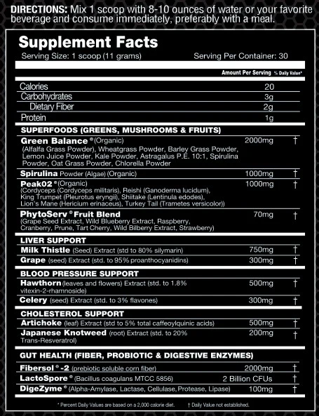 Superfoods is a blend of phytonutrient-packed greens, mushrooms, and fruits. This includes the premium-branded Greens Balance, PeakO2, and PhytoServ Fruit Blend (which provide a natural and powerful source of natural antioxidants to support the body from the harmful effects of oxidative stress). Our Superfoods blend also includes a full 1,000mg of Spirulina, a unique blue-green algae that is incredibly nutritious and offers numerous benefits.*